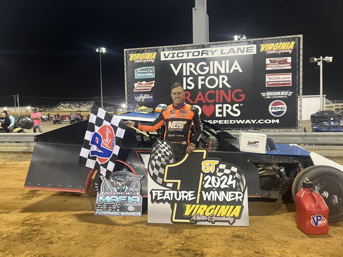 Nick Hoffman made a mid-week decision to compete in the Modified ranks over the weekend and it paid off with a $10,000 payday. He pulled off a late-race victory on Saturday night at Bill Sawyer's Virginia Motor Speedway aboard the Jerry Foster Racing / ABC Supply / NOS Energy Drink No. 5 CertainTeed / Elite Chassis Modified.